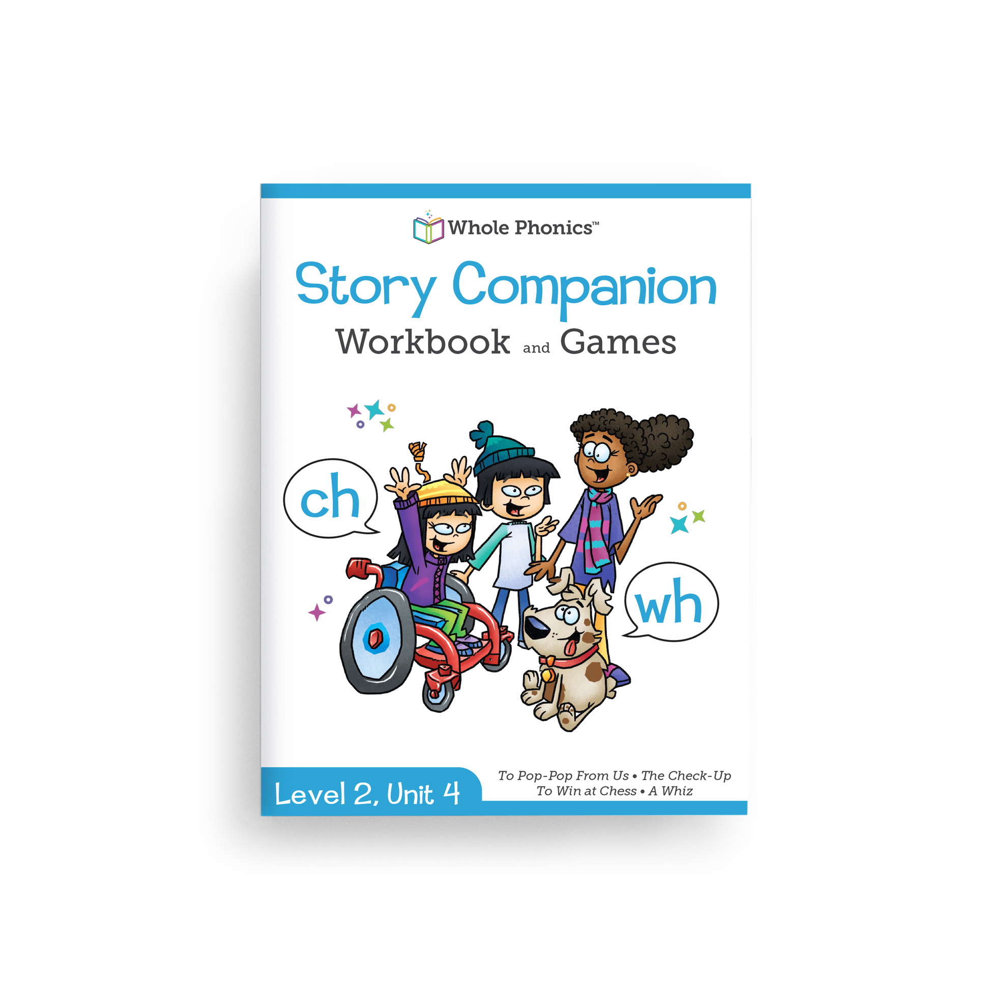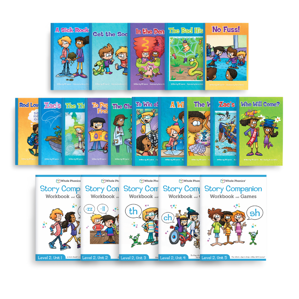 Our "Digraph Decodable Book and Workbook Set" includes 15 colorful decodable books and five corresponding activity workbooks. Level 2 targets digraphs (ch, th, sh, wh, ck, -ss, -ll, -ff, -zz). Each book is 16 pages and each activity workbook is approximately 45 pages.