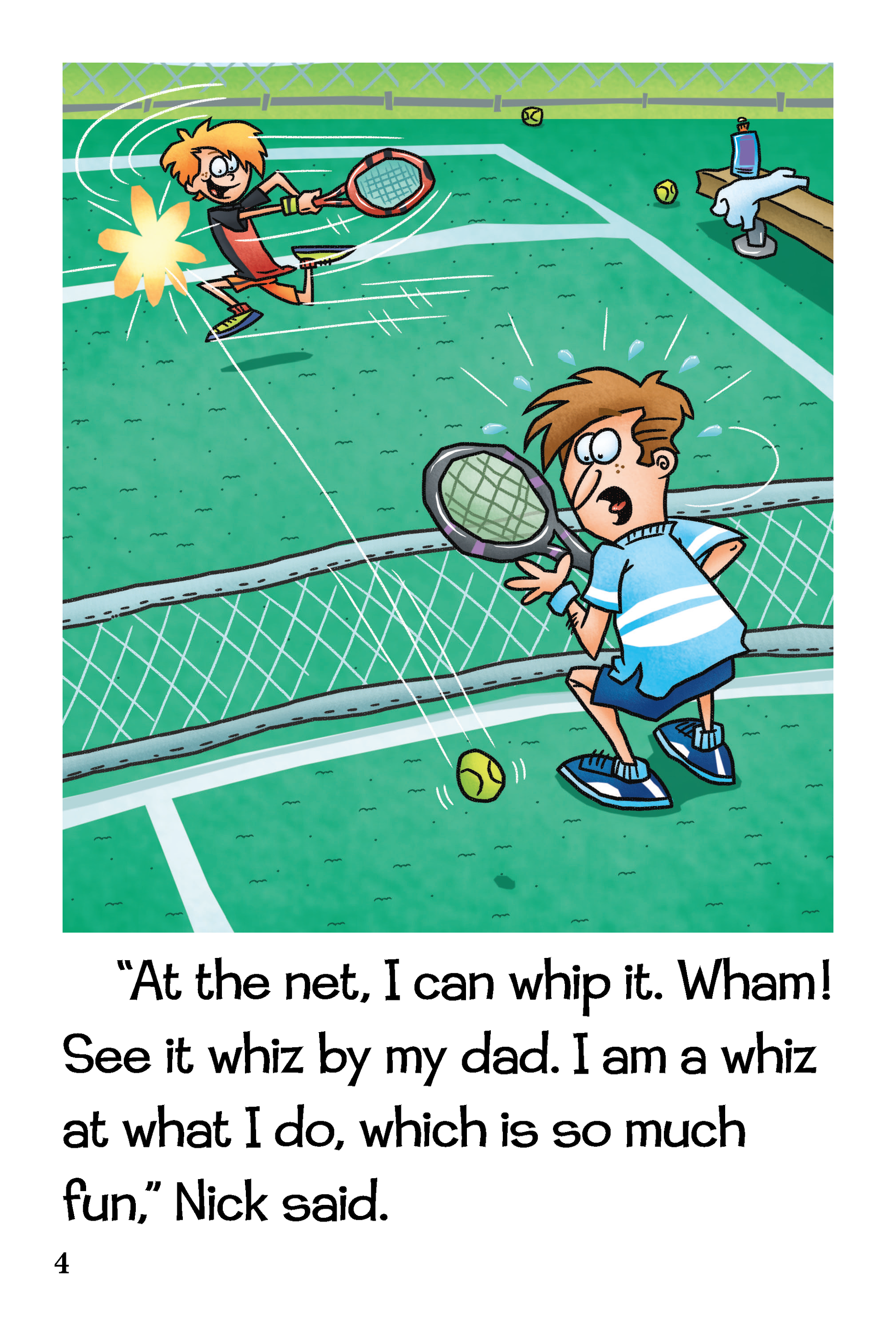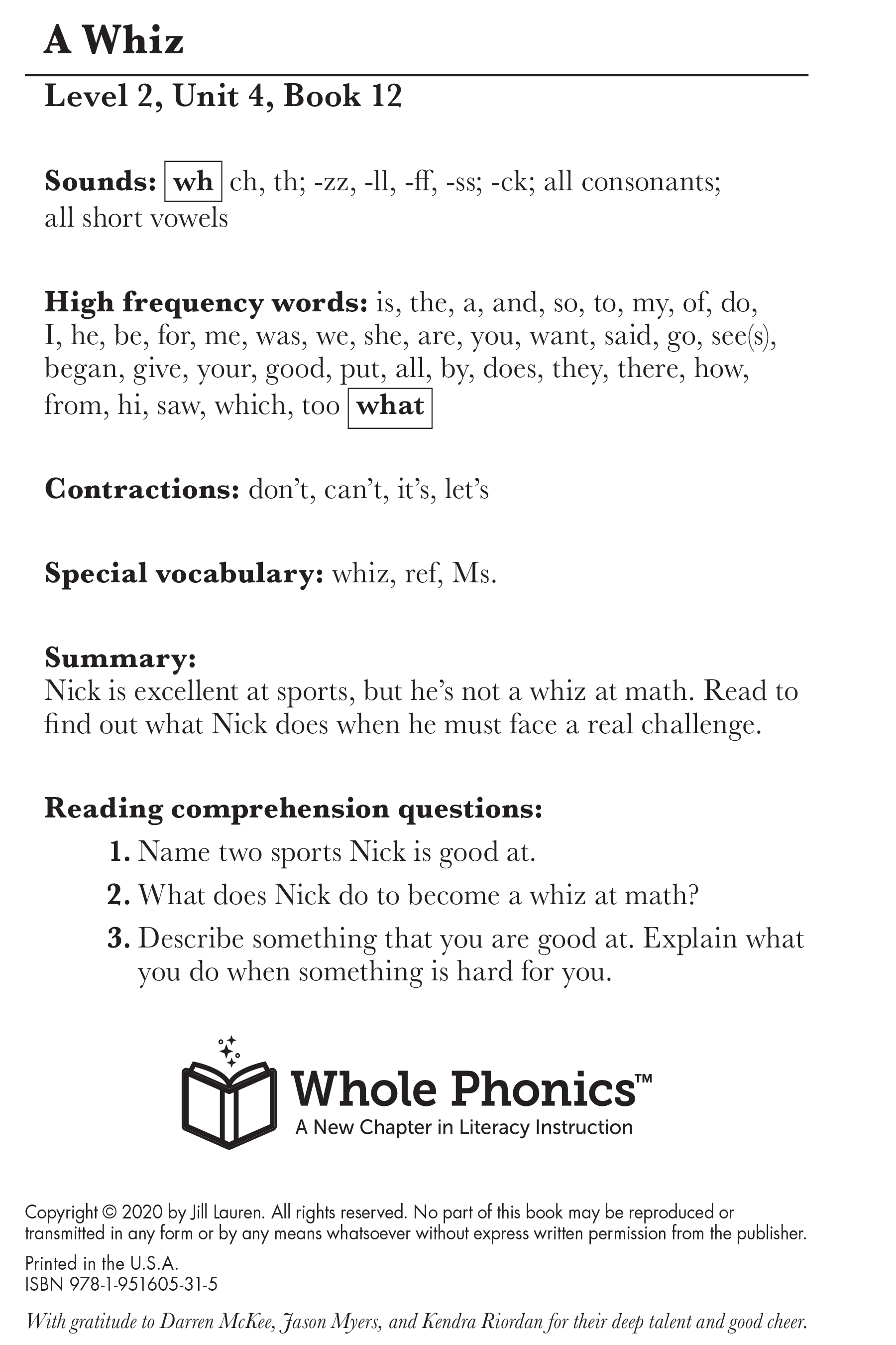 In this book, Nick is excellent at sports, but he's not a whiz at math. Students will read to find out what Nick does when he faces a real challenge. This book includes three reading comprehension and is filled with "wh" words such as "whack," "wham," and "whip."