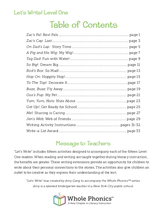 Let’s Write! includes fifteen phonics-based writing activities designed to accompany each of the fifteen Level One readers. When reading and writing are taught together during literacy instruction, the benefits are greater.